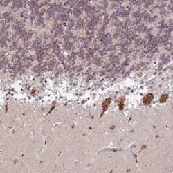 - Immunohistochemical staining of TMEM246 in human cerebellum using a TMEM246 Polyclonal Antibody (Product # PA5-62901) shows strong granular cytoplasmic and nuclear positivity in Purkinje cells.