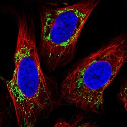 - Immunofluorescent staining of TMEM246 in human cell line U-2 OS using a TMEM246 Polyclonal Antibody (Product # PA5-52817) shows localization to mitochondria.