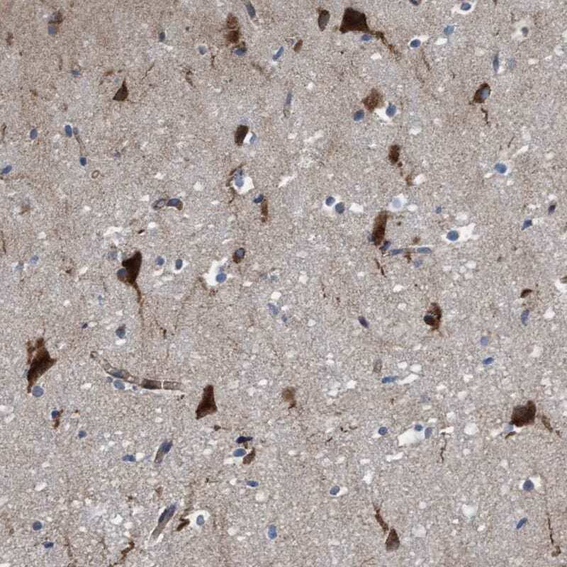 - Immunohistochemical staining of GARNL4 in human cerebral cortex using a GARNL4 Polyclonal Antibody (Product # PA5-54630) shows strong cytoplasmic positivity in neuronal and glial cells.