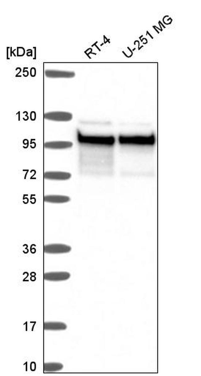 - Western blot analysis of C14orf4 in human cell line RT-4 and human cell line U-251 MG. Samples were probed using a C14orf4 Polyclonal Antibody (Product # PA5-66377).