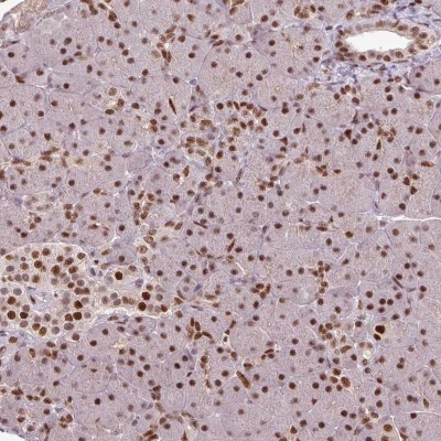 - Immunohistochemistry-Paraffin: IRF2BPL Antibody [NBP2-14712] - Staining of human pancreas shows moderate nuclear positivity in exocrine glandular cells.