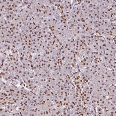 - Immunohistochemistry-Paraffin: IRF2BPL Antibody [NBP2-14712] - Staining of human pancreas shows strong nuclear positivity in exocrine glandular cells and islets of Langerhans.