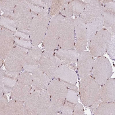 - Immunohistochemistry-Paraffin: IRF2BPL Antibody [NBP2-14712] - Staining of human skeletal muscle shows moderate nuclear positivity in myocytes.