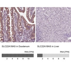 - Immunohistochemistry-Paraffin: solute carrier family 22, member 18 antisense Antibody [NBP2-39093] - Staining in human duodenum and liver tissues using anti-SLC22A18AS antibody. Corresponding SLC22A18AS RNA-seq data are presented for the same tissues.
