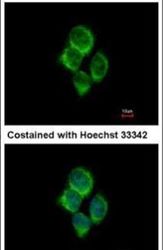 - Immunofluorescent analysis of SLC22A18AS in methanol-fixed A431 cells using a SLC22A18AS polyclonal antibody (Product # PA5-31339) at a 1:500 dilution.