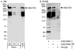 - Detection of human HECTD1 by western blot and immunoprecipitation. Samples: Whole cell lysate from HeLa (5, 15 and 50 µg for WB; 1 mg for IP, 20% of IP loaded) and 293T (T; 50 µg) cells. Antibodies: Affinity purified rabbit anti-HECTD1 antibody A302-908A used for WB at 0.1 µg/ml (A) and 1 µg/ml (B) and used for IP at 3 µg/mg lysate. HECTD1 was also immunoprecipitated by rabbit anti-HECTD1 antibody A302-909A, which recognizes a downstream epitope. Detection: Chemiluminescence with exposure times of 3 minutes (A and B).
