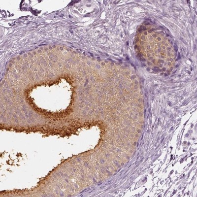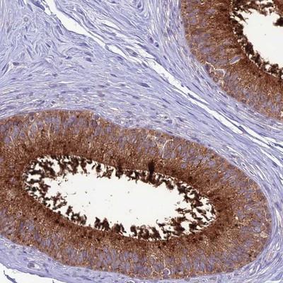 - Immunohistochemistry-Paraffin: ELSPBP1 Antibody [NBP2-13957] - Staining of human epididymis shows strong cytoplasmic positivity in glandular cells.