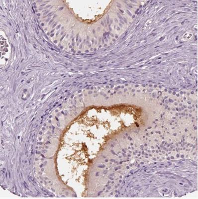 - Immunohistochemistry-Paraffin: ELSPBP1 Antibody [NBP2-13958] - Staining of human epididymis shows moderate cytoplasmic positivity in glandular cells.