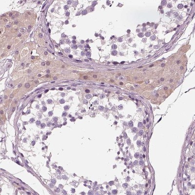 - Immunohistochemistry-Paraffin: ELSPBP1 Antibody [NBP2-13958] - Staining of human testis shows moderate cytoplasmic positivity in Leydig cells.