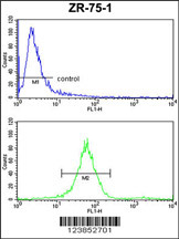 - ATP5C1 Antibody (N-term) FC analysis of ZR-75-1 cells (bottom histogram) compared to a negative control cell (top histogram). FITC-conjugated goat-anti-rabbit secondary antibodies were used for the analysis.