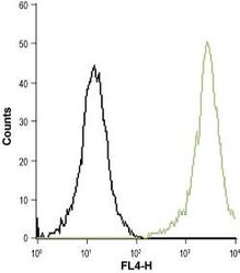 - Cell surface detection of CysLTR1 in live intact THP-1 (acute monocytic leukemia) cells: - (black) Cells + goat- Anti-rabbit-Cy5. (green) Cells + Anti-CysLTR1 (extracellular) Antibody (#ALR-003), (1:50) + goat- Anti-rabbit-Cy5.