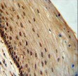 - SPDYE3 antibody immunohistochemistry of formalin-fixed and paraffin-embedded human cervical tissue followed by peroxidase-conjugated secondary antibody and DAB staining.
