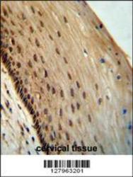 - SPDYE3 antibody (Center) (Cat. #AP10357c) immunohistochemistry analysis in formalin fixed and paraffin embedded human cervical tissue followed by peroxidase conjugation of the secondary antibody and DAB staining. This data demonstrates the use of the SPDYE3 antibody (Center) for immunohistochemistry. Clinical relevance has not been evaluated.