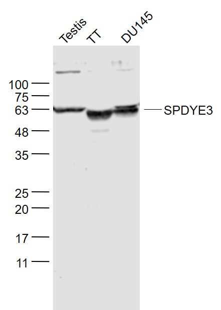 - Lane 1: Mouse testis lysates; Lane 2: TT cell lysates; Lane 3: DU145 cell lysates probed with SPDYE3 Polyclonal Antibody, Unconjugated (bs-17464R) at 1:300 dilution and 4°C overnight incubation. Followed by conjugated secondary antibody incubation at 1:20000 for 60 min at 37°C.