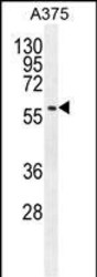 - Western blot analysis of SPDYE3 in A375 cell line lysates. Samples were incubated with SPDYE3 polyclonal antibody (Product # PA5-23861). Lysates: 35 µg/lane. SPDYE3 protein (arrow).