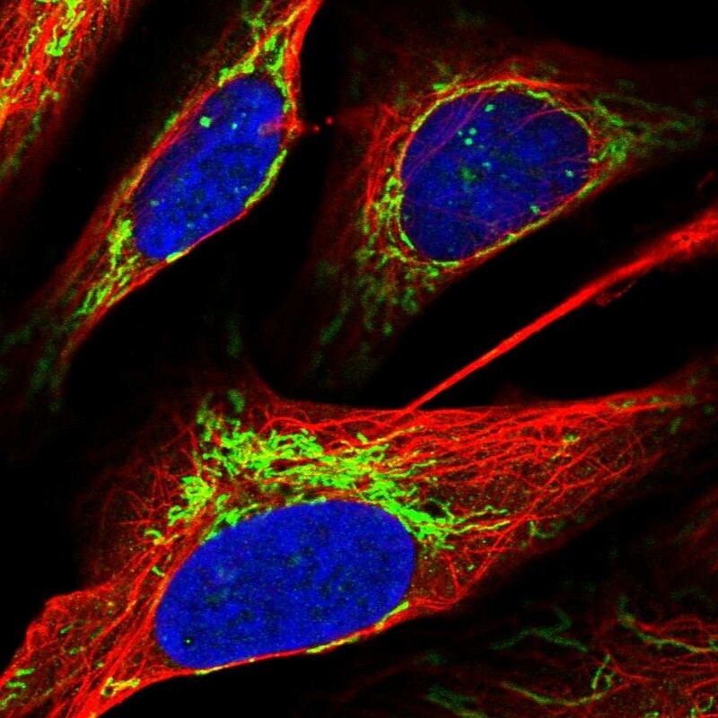 - Immunofluorescent staining of human cell line U-2 OS shows localization to mitochondria.