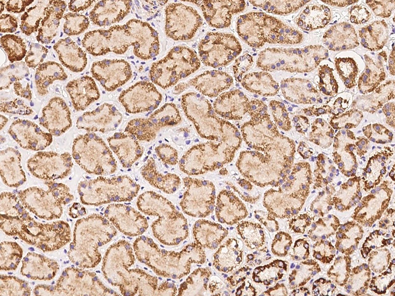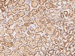 - Immunohistochemical staining of human ACOT1 in human kidney with ACOT1 Polyclonal Antibody (Product # PA5-117764, 1:500 dilution, formalin-fixed paraffin embedded sections).