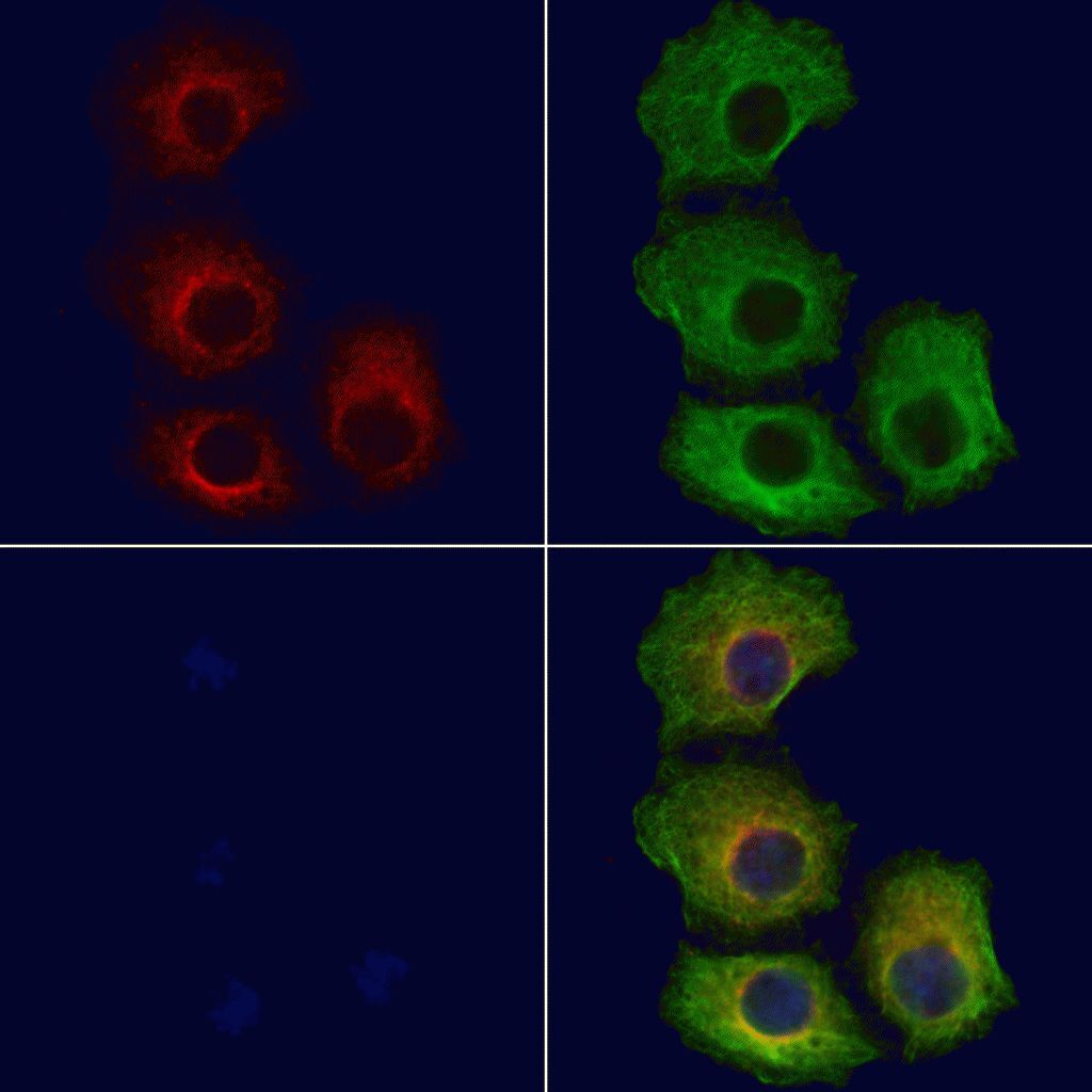 - Immunofluorescent analysis of IL28B/ IFNL3 in HeLa cells. Samples were fixed with paraformaldehyde, permeabilized with 0.1% Triton X-100, blocked with 10% serum (45 min at 25°C), incubated with mouse anti-beta tubulin and IL28B/ IFNL3 polyclonal antibody (Product # PA5-103439) using a dilution of 1:200 (1 hr, 37°C), and followed by goat anti-rabbit IgG Alexa Fluor 594 (red) and goat anti-mouse IgG Alexa Fluor 488 (green).