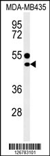 - CD1E Antibody (Center) western blot analysis in MDA-MB435 cell lysates (35ug/lane).This demonstrates the CD1E antibody detected the CD1E protein (arrow).