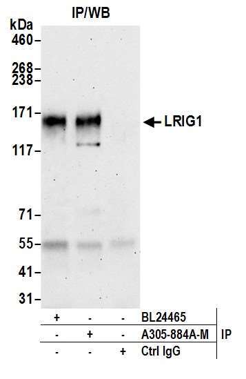 - Detection of human LRIG1 by western blot of immunoprecipitates. Samples: Whole cell lysate (1.0 mg per IP reaction; 20% of IP loaded) from HeLa cells prepared using NETN lysis buffer. Antibodies: Affinity purified rabbit anti-LRIG1 antibody (Product # A305-884A-T; lot A305-884A-T-1) used for IP at 40 µL per reaction. LRIG1 was also immunoprecipitated by rabbit anti-LRIG1 antibody BL24465. For blotting immunoprecipitated LRIG1, Product # A305-884A-T was used at 1:1000. Detection: Chemiluminescence with an exposure time of 75 seconds.