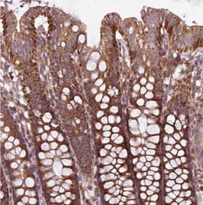 - Immunohistochemistry-Paraffin: PLEKHD1 Antibody [NBP2-14750] - Staining of human colon shows strong cytoplasmic positivity in glandular cells.
