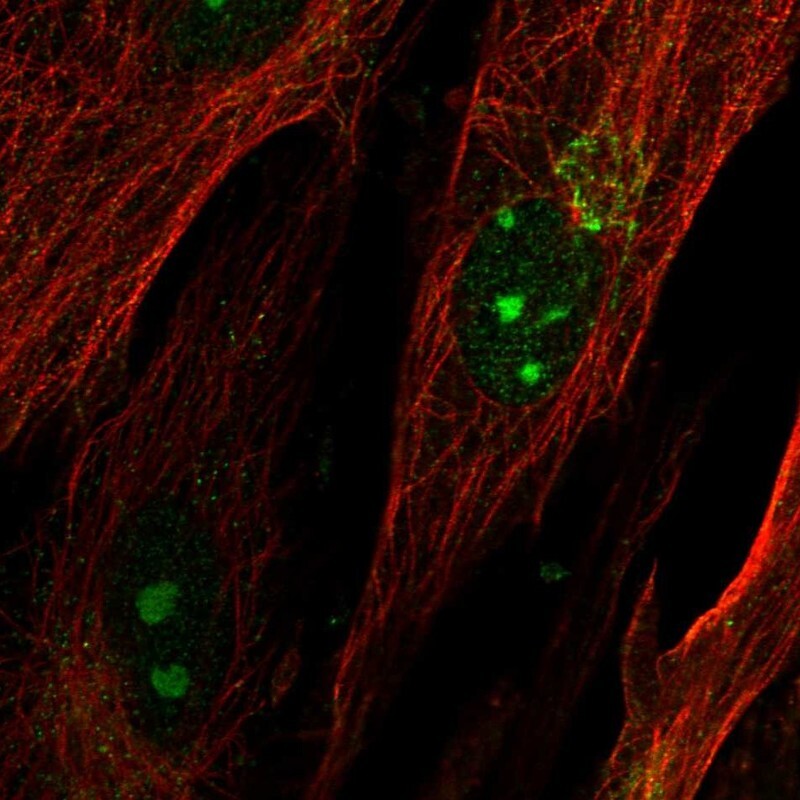 - Immunofluorescent staining of human cell line BJ shows localization to nucleoli & the Golgi apparatus.