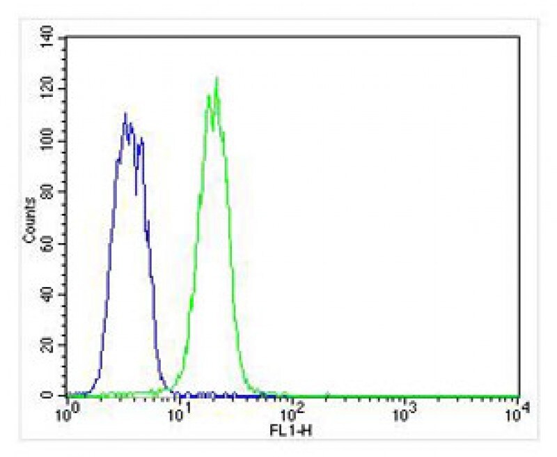 - Flow cytometry of (overlay histogram) of Cytokeratin 12 in K562 cells (green line). Samples were incubated with Cytokeratin 12 polyclonal antibody (Product # PA5-71744) using a dilution of 1:25 dilution for 60 min at 37°C followed by Alexa Fluor® 488 goat anti-rabbit lgG (H+L) at 1:400 dilution for 40 min at 37°C. The cells were fixed with 4% paraformaldehyde (10 min) and then permeabilized with 90% methanol for 10 min. The cells were then incubated in 2% bovine serum albumin to block non-specific protein-protein interactions followed by the primary antibody. Isotype control antibody (blue line) was rabbit IgG1 (1 μg/1x10^6 cells) used under the same conditions. Acquisition of >10, 000 events was performed.