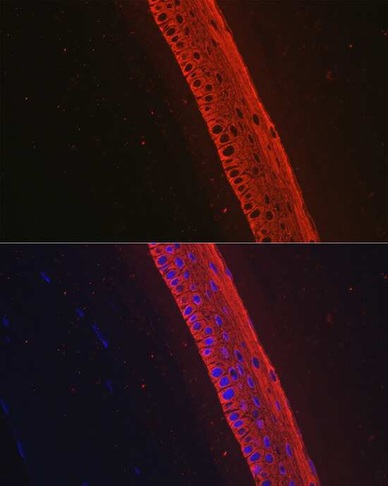 - Immunocytochemical analysis of Cytokeratin 12 in Mouse eye using a Cytokeratin 12 Recombinant Monoclonal antibody (Product # MA5-42701). Blue: DAPI for nuclear staining.