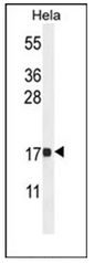 - Western blot analysis of FAM104B Antibody (N-term) Cat.-No AP51516PU-N in Hela cell line lysates (35ug/lane). This demonstrates the FAM104B antibody detected the FAM104B protein (arrow).