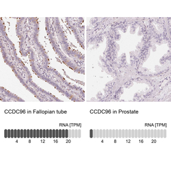 - Immunohistochemistry analysis in human fallopian tube and prostate tissues using Anti-CCDC96 antibody. Corresponding CCDC96 RNA-seq data are presented for the same tissues.