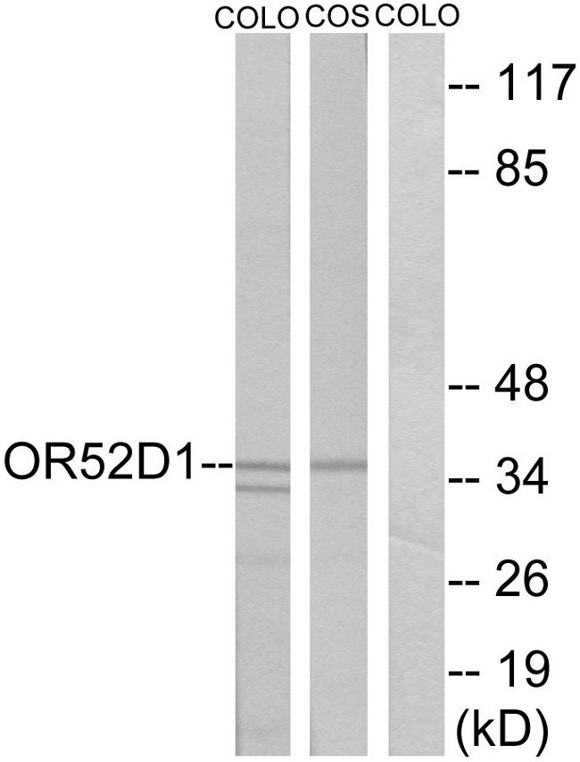 - Western blot analysis of lysates from COLO and COS7 cells, using OR52D1 Antibody. The lane on the right is blocked with the synthesized peptide.