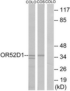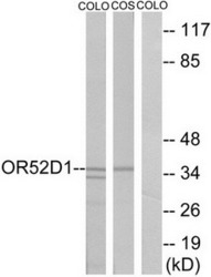 - Western blot analysis of extracts from COLO cells and COS cells, using OR52D1 antibody. The lane on the right is treated with the synthesized peptide.