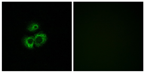 - Immunofluorescence analysis of MCF-7 cells, using OR52D1 antibody. The picture on the right is treated with the synthesized peptide.