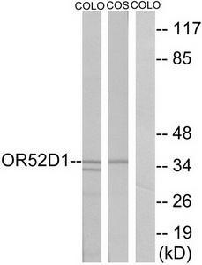 - Western blot analysis of extracts from COLO cells and COS cells, using OR52D1 antibody.The lane on the right is treated with the synthesized peptide.