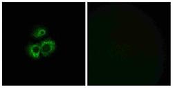 - Western blot analysis of lysates from COLO and COS7 cells, using OR52D1 Antibody. The lane on the right is blocked with the synthesized peptide.