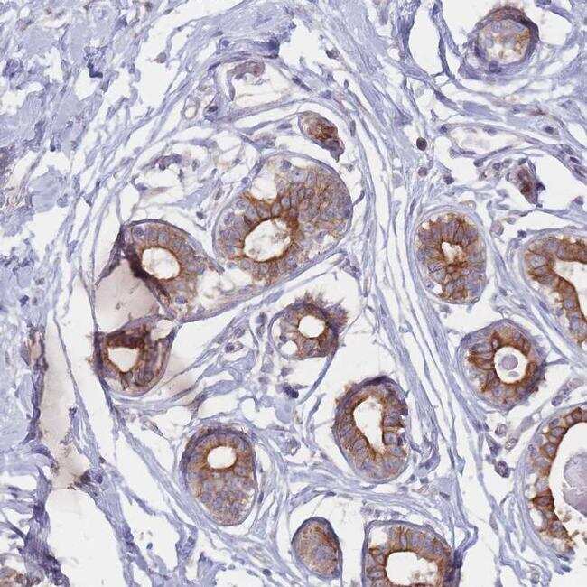 - Immunohistochemical analysis of CCDC48 in human breast using CCDC48 Polyclonal Antibody (Product # PA5-62261) shows strong membranous positivity in glandular cells.