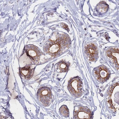 - Immunohistochemistry-Paraffin: CCDC48 Antibody [NBP2-14451] - Staining of human breast shows strong membranous positivity in glandular cells.