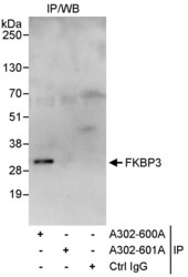 - Detection of human FKBP3 by western blot of immunoprecipitates. Samples: Whole cell lysate (1 mg for IP, 20% of IP loaded) from HeLa cells. Antibodies: Affinity purified rabbit anti-FKBP3 antibody A302-600A used for IP at 3 µg/mg lysate. FKBP3 was not successfully immunoprecipitated by rabbit anti-FKBP3 antibody A302-601A, which recognizes a downstream epitope. For blotting immunoprecipitated FKBP3, A302-601A was used at 1 µg/ml. Detection: Chemiluminescence with an exposure time of 30 seconds.