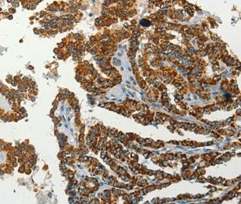 - Immunohistochemical analysis of SERPINA9 in paraffin embedded Human thyroid cancer tissue using SERPINA9 Polyclonal Antibody (Product # PA5-50618) at a 1:60 dilution.