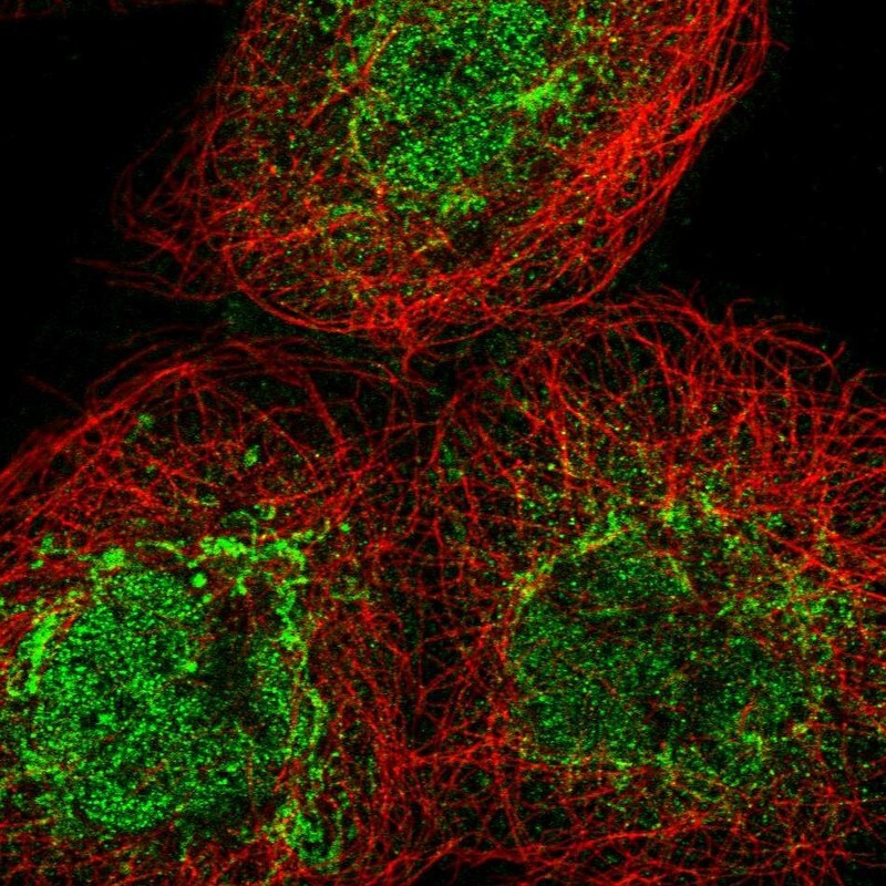 - Immunofluorescent staining of human cell line A-431 shows localization to nucleoplasm & mitochondria.