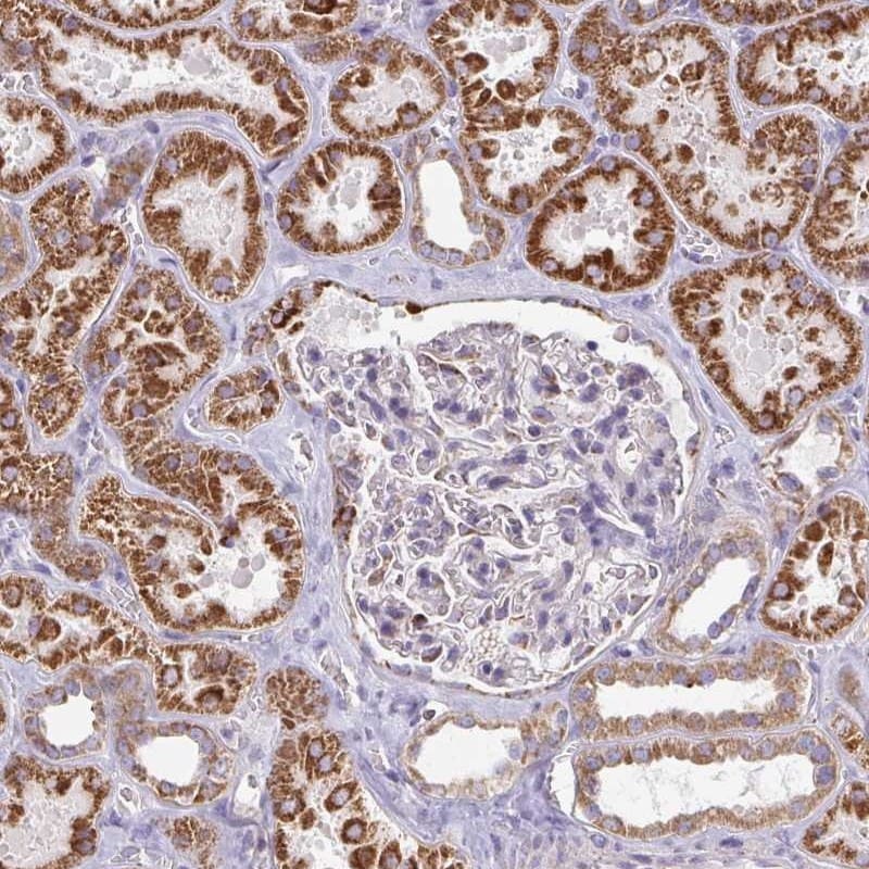 - Immunohistochemical staining of FAHD1 in human kidney shows strong cytoplasmic positivity in cells in tubules. Samples were probed using a FAHD1 Polyclonal Antibody (Product # PA5-65362).