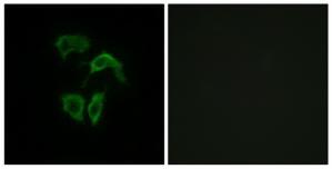 - Immunofluorescence analysis of HepG2 cells, using OR2A4/2A7 antibody.The picture on the right is treated with the synthesized peptide.