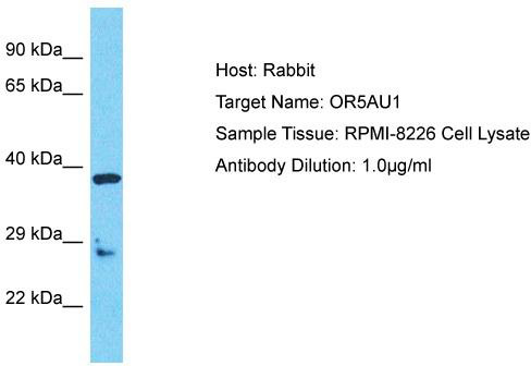 - Host: Rabbit; Target Name: OR5AU1; Sample Tissue: RPMI-8226 Whole Cell lysates; Antibody Dilution: 1.0ug/ml