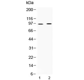 - Western blot testing of 1) rat heart and 2) human HepG2 lysate with AKAP2 antibody at 0.5ug/ml. Predicted molecular weight ~95 kDa.