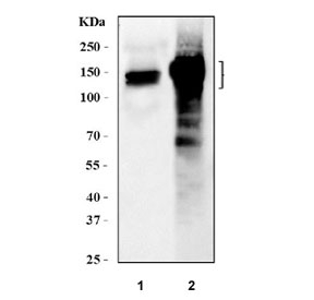- Western blot testing of 1) human PC-3 and 2) mouse lung tissue lysate with AKAP2 antibody at 0.5ug/ml. Predicted molecular weight ~95 kDa (multiple isoforms).