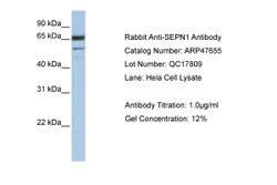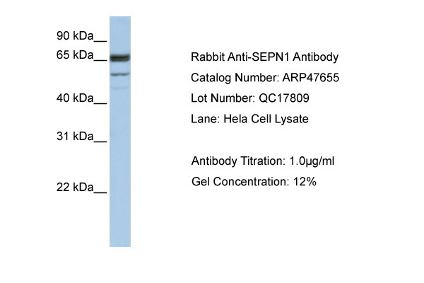 - Western blot analysis using Anti-SEPN1 antibody detects protein at predicted molecular weight using Hela Cells as a positive control. Tissue/Lysate Concentration: 1ug/ml Antibody Concentration: 1.0ug/ml