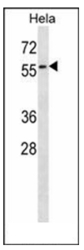 - Western blot analysis of SEPN1 Antibody (C-term) in Hela cell line lysates (35ug/lane).This demonstrates the SEPN1 antibody detected the SEPN1 protein (arrow).