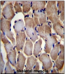 - Immunohistochemistry analysis in Formalin Fixed, Paraffin Embedded Human skeletal muscle tissue stained with SEPN1 antibody (C-term) followed by peroxidase conjugation of the secondary antibody and DAB staining. This data demonstrates the use of SEPN1 Antibody (C-term) for immunohistochemistry. Clinical relevance has not been evaluated.