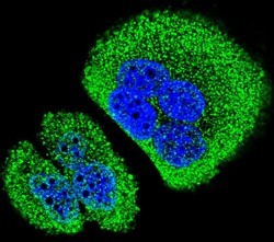 - Confocal immunofluorescent analysis of ANKRD58 Antibody (C-term) with A549 cell followed by Alexa Fluor 488-conjugated goat anti-rabbit lgG (green). DAPI was used to stain the cell nuclear (blue).