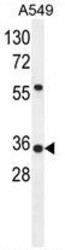 - ANKRD58 Antibody (C-term) western blot analysis in A549 cell line lysates (35ug/lane).This demonstrates the ANKRD58 antibody detected the ANKRD58 protein (arrow).